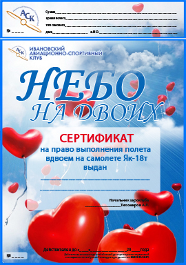 Мы представляем вашему вниманию новый подарочный сертификат, созданный специально для влюбленных. Услуга «Небо на двоих» дает возможность совершить незабываемый романтический полет вдвоем на комфортном самолете Як-18т! Вас ждет захватывающая воздушная экскурсия, во время которой вы сможете увидеть город Иваново с высоты полета, а также полюбоваться красотой Дуниловского монастыря! За штурвалом самолета будет находиться опытный летчик, который покажет вам всю красоту и романтику полета! Кстати, с собой на борт самолета вы сможете пригласить фотографа или оператора или любого другого спутника (третье место в самолете по сертификату предоставляется бесплатно при вашем желании).